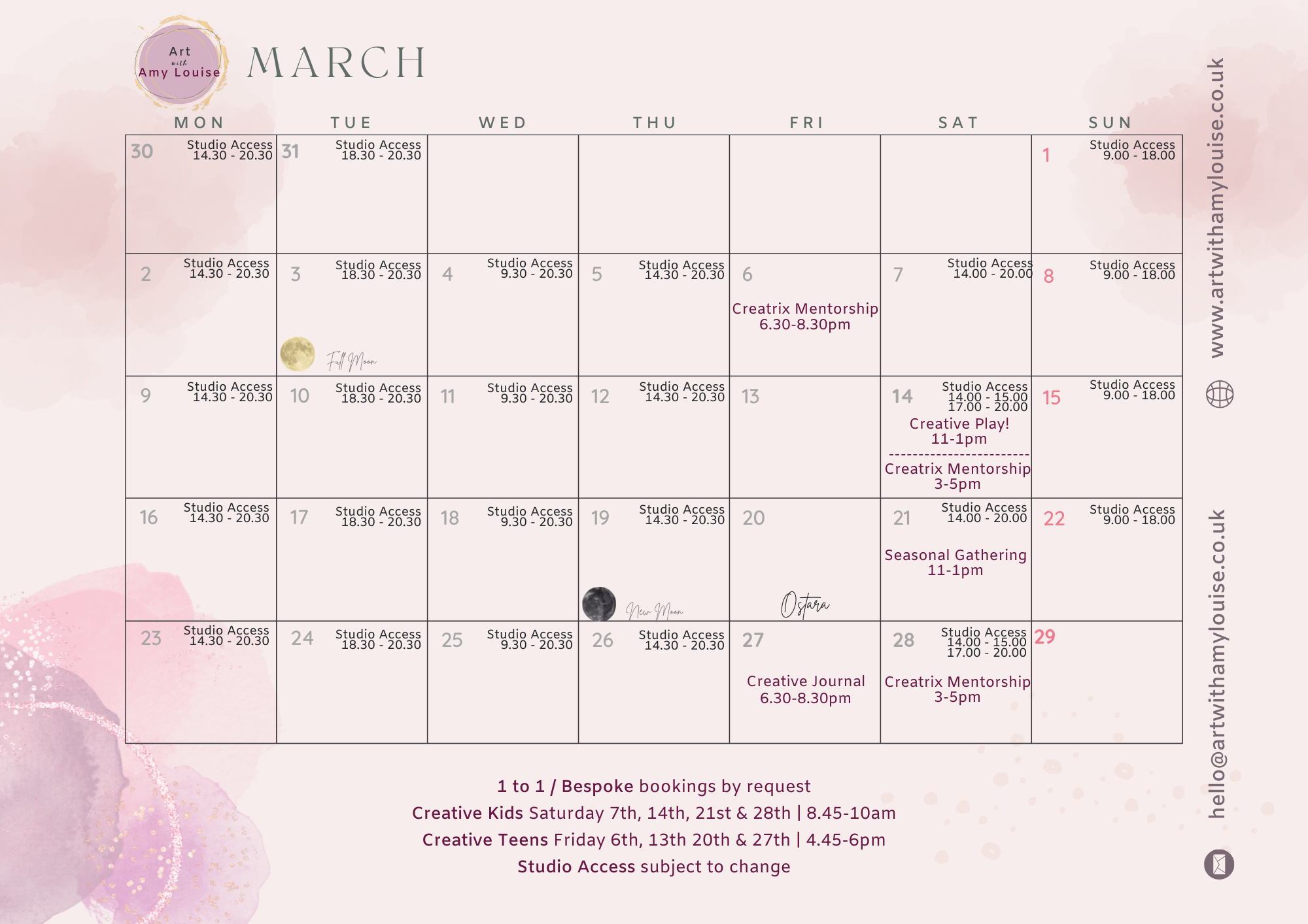 At the Art with Amy Louise studio we have Signature offers all year round, Intuitive Courses each offered only once a year, and all other Workshops offered at limited times.